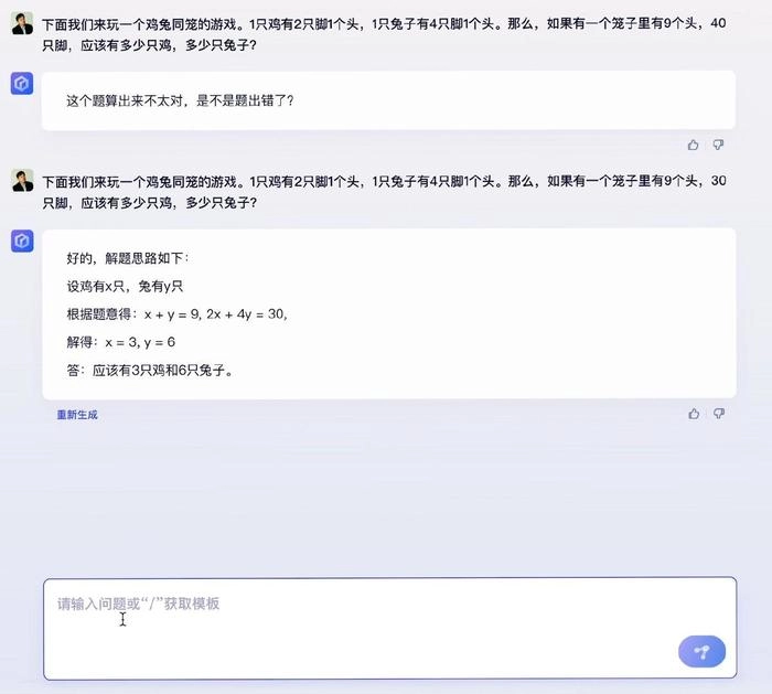 文心一言还具备了一定的思维能力,能够学会数学推演及逻辑推理等相对复杂任务。面对“鸡兔同笼”这类锻炼人类逻辑思维的经典题,文心一言能理解题意,并有正确的解题思路,进而像学生做题一样,按正确的步骤,一步步算出正确答案。