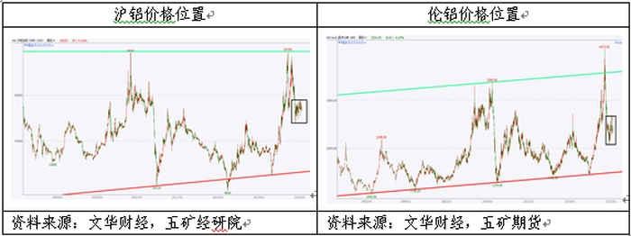 沪铝期货价格长期运行区间在11000-25000元/吨,短期运行区间在17000-19500元/吨;伦铝期货价格长期运行区间在1450-3600美元/吨,短期运行区间在2080-2700美元/吨。2月28日,沪铝主力合约收盘价18460元/吨,伦铝期货收盘价2372美元/吨,回落至长期价格区间和短期区间中部位置附近。