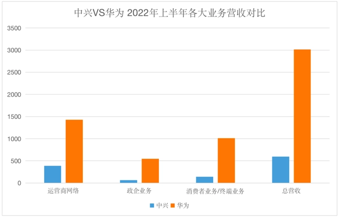 不止政企业务,华为在另外两项业务上也实现了碾压。2022年上半年,华为实现销售收入3016亿元人民币,是中兴通讯同期的5.04倍。其中,运营商业务收入为1427亿元人民币,是中兴通讯同期的3.69倍;终端业务收入为1013亿元人民币,是中兴通讯同期的7.04倍。