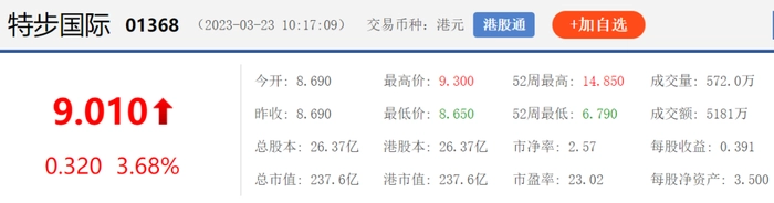 3月22日,特步发布2022年年报及2022年四季报。 财报发布后,特步股价连续两日大幅上涨。 截至发稿时,当日股价最高达9.30港元/股,最大涨幅超7%。
