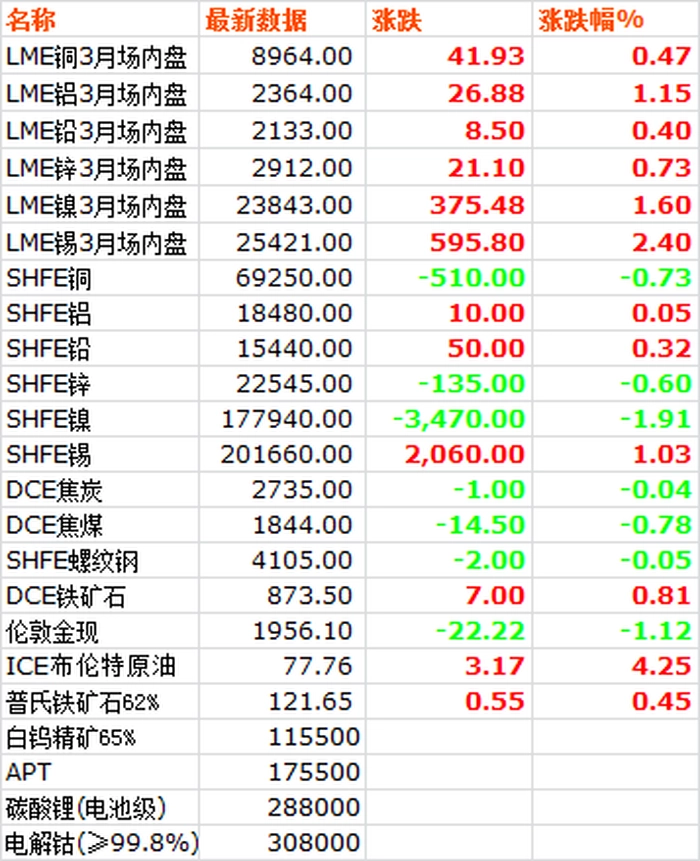 3月27日周一,LME六种基本金属价格全线上涨,低开高走高收,锡镍铝涨幅居前。三月期锡价领涨大盘,收于25421,上涨2.4%。三月期镍价收于23843,上涨1.6%。三月期铝价收于2364,上涨1.15%。三月期锌价收于2912,上涨0.73%。三月期铜价围绕8900上下窄幅拉锯后收于8964,上涨0.47%。三月期铅价收于2133,上涨0.4%。