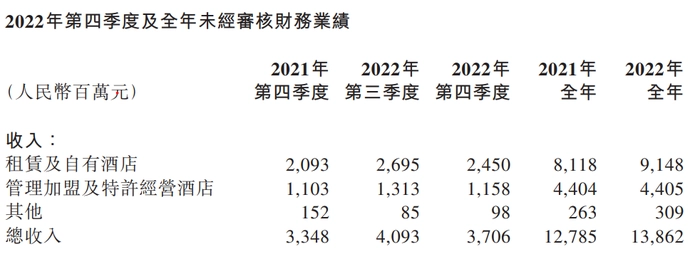 3月27日晚,华住集团披露了2022年第四季度及全年未经审核财务业绩报告。