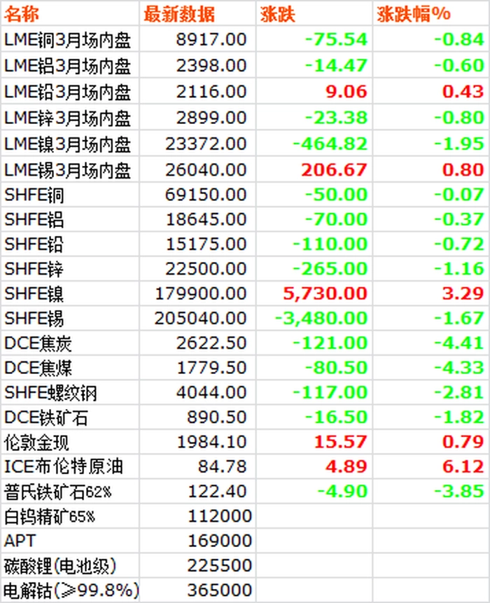 4月3日,LME六种基本金属价格继续跌多涨少,锡铅上涨,其它金属下跌。三月期锡价领涨大盘,收于26040,上涨0.8%。三月期铅价收于2116,上涨0.43%。三月期镍价领跌大盘,收于23372,下跌1.95%。三月期铜价围绕8900之上窄幅拉锯后收于8917,下跌0.84%。三月期锌价收于2899,下跌0.8%。三月期铝价收于2398,下跌0.6%。