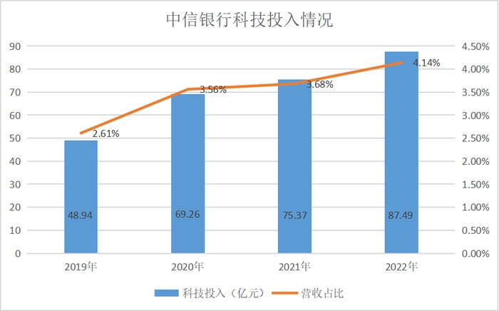 梳理历年财报可知,中信银行的科技投入和营收占比都在持续提升。2022年全年,中信银行信息科技投入87.49亿元,较2021年末增长16.08%,较2019年末增长78.77%;占营业收入比例达4.14%,较2019年增长了1.53个百分点。
