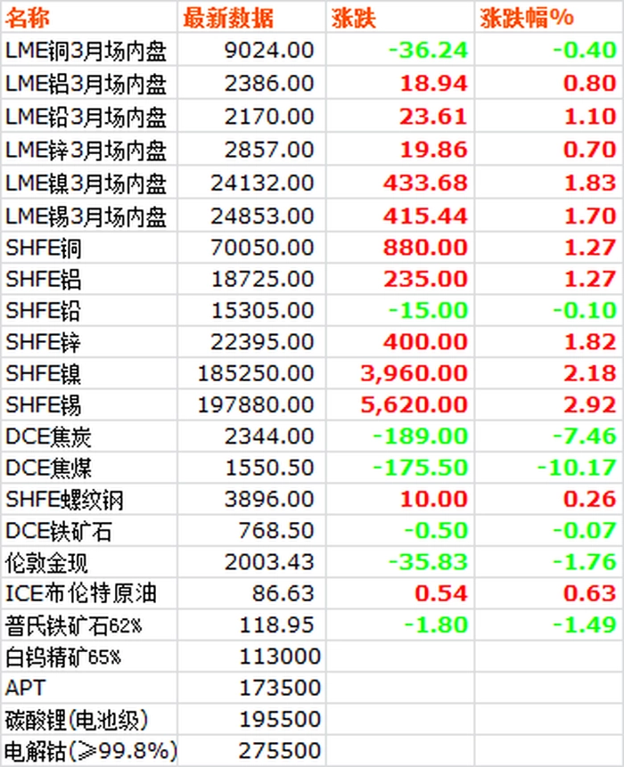 4月14日,LME六种基本金属价格除铜外普遍上涨,低开高走高收,镍锡涨幅居前。三月期镍价领涨大盘,收于24132,上涨1.83%。三月期锡价收于24853,上涨1.7%。三月期铅价收于2170,上涨1.1%。三月期铝价收于2386,上涨0.8%。三月期锌价收于2857,上涨0.7%。三月期铜价冲高回落,最高9183,收于9024,下跌0.4%。