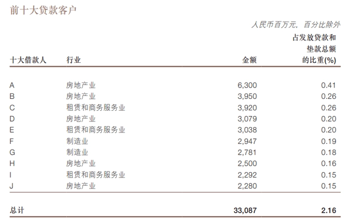 从上表数据可知,浙商银行排名第一的贷款第一大户的房企贷款金额为63亿元,占浙商银行总贷款的0.41%。上榜的五大房地产客户总贷款金额为181亿元,占十大客户总贷款330.87亿元的55%。占总贷款1.525万亿元的1.18%。