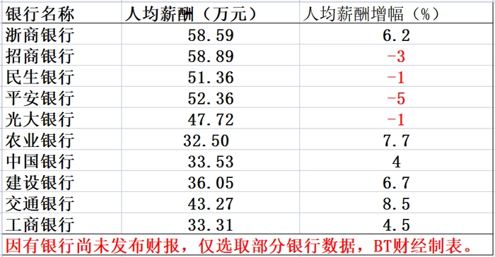 而58.59万元的人均薪酬,同样在众多银行中名列前茅。BT财经查询多家银行人均薪酬,做出如下表格,可以让各大银行的人均薪酬一目了然。其中在选取的10家银行中,浙商银行的薪酬仅次于招商银行的58.89万元,但招商银行的人均薪酬下降了3%,而浙商银行的人均薪酬上涨了6.2%。浙商银行的人均薪酬已经碾压了国有五大行,国有五大行人均薪酬最高的为交通银行的43.27万元,和浙商银行的人均薪酬差距超过15万元。