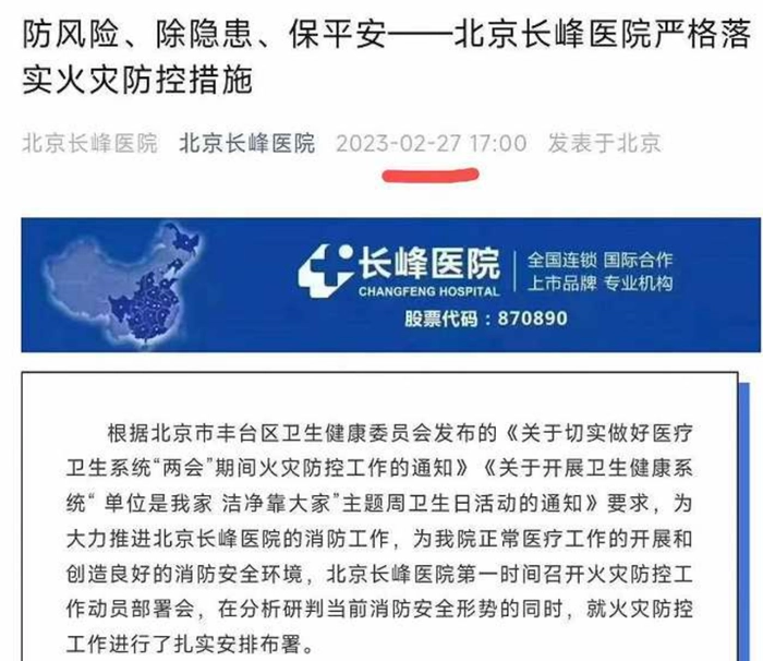 讽刺的是,在2月27日长峰医院官网还发布了一篇题为《防风险、除隐患、保平安——北京长峰医院严格落实火灾防控措施》的文章,称该院根据政府监管部门通知要求,“第一时间召开了火灾防控工作动员部署会,在分析研判当前消防安全形势的同时,就火灾防控工作进行了扎实安排部署”。这样大张旗鼓地消防安全宣传却出现如此重大的火灾事故,“打脸”来得过快。