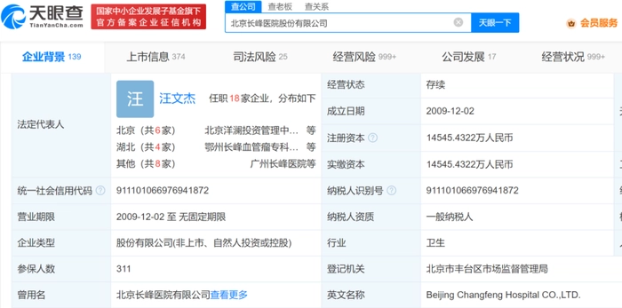 通过天眼查可以发现,汪文杰目前任职18家企业,这些企业多为医疗相关领域。其中北京有6家企业,湖北有4家企业,其他地区有8家企业。长峰医院注册资本为1.45亿元,参保人数311人。在民营医院之中算是规模较大的一家。