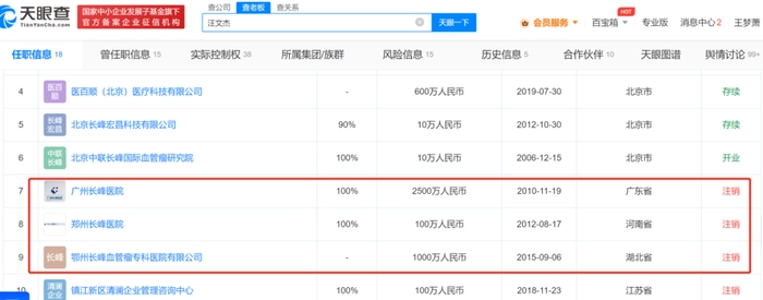 据长峰医院财报披露,拥有成都长峰医院、重庆长峰医院、西安长峰医院、贵阳长峰领航医院、郑州长峰医院等20多家医院。但天眼查显示有些医院已经注销,比如广州长峰医院于2018年12月26日被注销,郑州长峰医院则早在2015年6月15日就被注销。