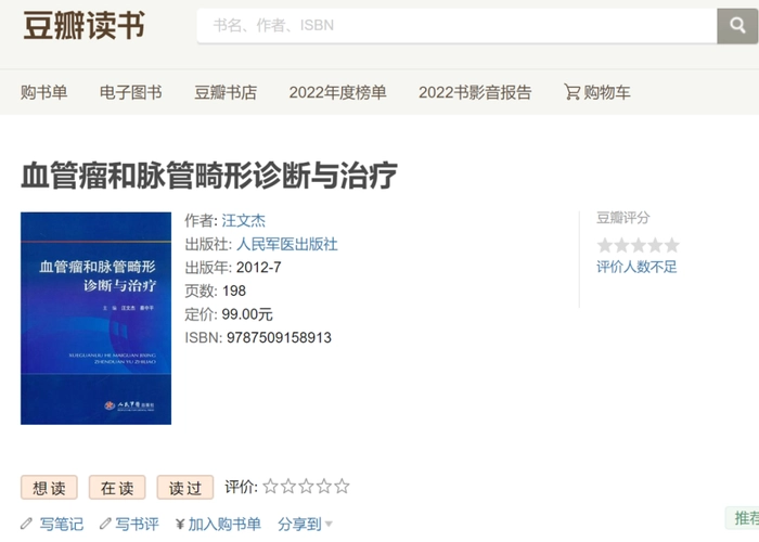 长峰医院宣传的汪文杰60多万字的防治血管瘤专著《血管瘤脉管畸形诊断与治疗》已经出版。但BT财经在全网搜索的时候,并未检索到该书目,只在豆瓣读书中查询到相关信息。只是此信息则和宣传的有较大出入,在咨询图书出版行业人士得知,198页的书,在不大量配图的情况下,只有20万字左右,远不可能达到60万字。而关于第28届国际血管联盟(IUA)相关信息中,也未检索到汪文杰的信息,在权威的知网上,同样未能检索到汪文杰的任何学术成果。