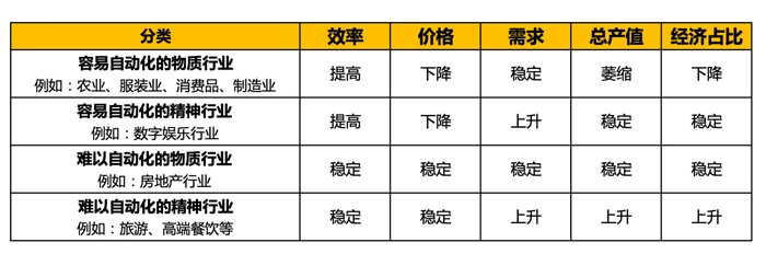 容易自动化的物质需求行业,如农业、服装业、汽车等消费品制造业,因为机器人和人工智能这些行业的效率大幅提升,成本和价格大幅下降,但是需求并不会因为价格下降而提升。因为物质的需求会饱和,一个人只能吃这么多穿这么多。所以总产值和GDP的占比都会下降。