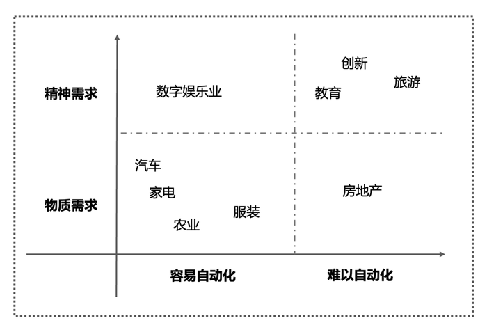 解答这些问题前,我们先来看一个行业象限图。我们把一些代表性行业分成两个维度,四个象限。横坐标是行业的科技自动化程度,从左边“容易自动化”到右边“难以自动化”。比较容易自动化的行业包括农业、家电、服装、汽车,还有数字娱乐行业。“难以自动化”的行业包括房地产行业,因为建筑工和装修工短期难以被机器人取代。旅游因为涉及到人的运输和服务,也比较难自动化。纵坐标是需求层次的维度,从低的“物质需求”到高的“精神需求”。人的物质需求包括“衣食住”等行业,物质的需求到一定数量以后会相对饱和,而精神需求几乎是无止境的。旅游、娱乐还有教育属于精神需求,创新满足了人类探索的本能,所以也是精神需求。