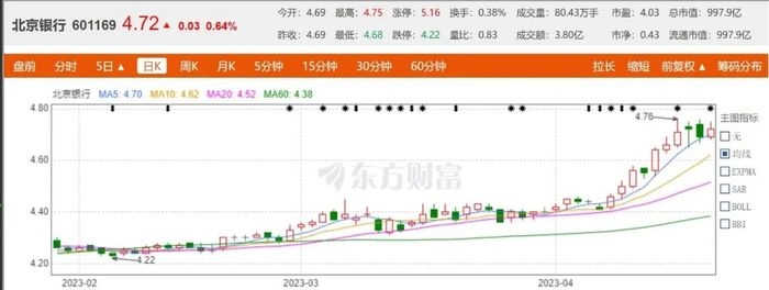 2022年3月才履新北京银行董事长的霍学文交出了一份看似不错的答卷,但在财报发布后第一个交易日,北京银行的股价不升反降,4月10日,收盘股价为4.41元,下跌0.68%。但随后股价录得3连涨,4月19日4.76元的股价为近年来新高。4月24日收盘,北京银行的股价为4.72元,上涨0.64%,总市值为997.9亿元。但股价较高点时的24.13元下跌超80%。