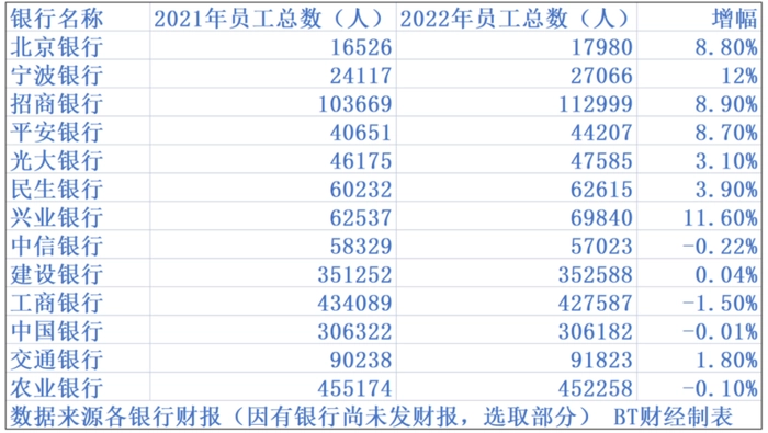 财报显示,2022年北京银行的员工总数为17980人,相比2021年的16526人增长了8.8%。员工总数增幅在已发布财报的银行中(截至4月12日),仅次于宁波银行、兴业银行和招商银行。而国有五大行中有3家为负增长,增幅最高的交通银行也不过1.8%,另外一家员工正增长的为建设银行,增幅仅为0.04%。