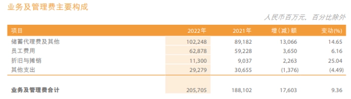 可以看到,无论是金额还是增幅,邮储银行自己的员工费用都比不上交给中国邮政的储蓄代理费,2022年员工费用为628.78亿元,同比增长6.16%。