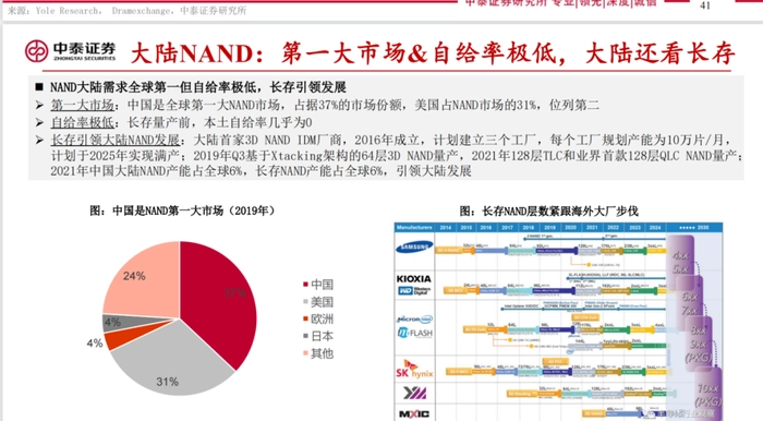 作为flash存储器的一种,Nand-flash存储器具有容量较大,改写速度快等优点,适用于大量数据的存储,因而在业界得到了越来越广泛的应用,但其市场份额同样被三星、铠侠、海力士以及美光等六家外国品牌所垄断,前6家厂商占据全球市场的93%。中泰证券数据显示,中国NAND市场约占全球市场的37%,但自给率极低,本土自给率几乎为0。