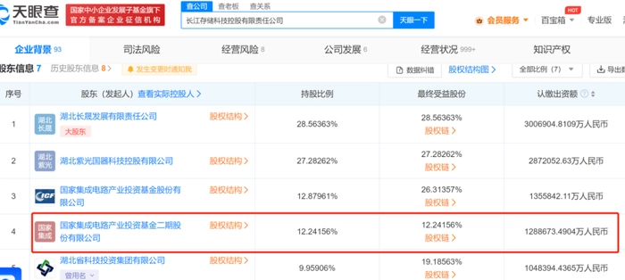 天眼查数据显示,长江存储的第一大股东为湖北长晟发展有限责任公司,该股东认缴出资300.69亿元,持股占比达到28.56%,成为目前长江存储单一持股比例最高的大股东。第二大股东为湖北紫光国器科技控股有限公司,出资287.2亿元,持股比例为27.29%。另外一家新注资的股东为长江产业投资集团,出资28.64亿元,持股比例为2.72%,为第七大股东。