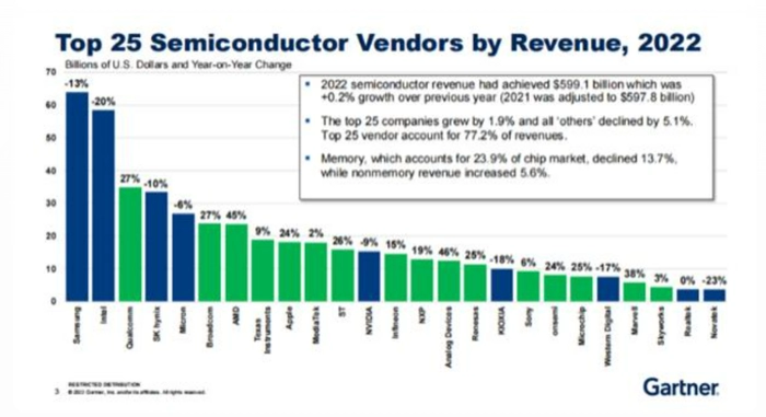 Gartner数据显示,2022年全球半导体厂商排名前25位中,排名前三的依然是三星、Intel和高通。海力士和美光位列四五位。2022年全球相关产业市场规模为5991亿美元,但同比只微增了0.2%,主要由于排名25名之后的企业下滑5.1%所致,前25名厂商增幅为1.9%。