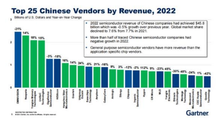 2022年,因受外部影响较大,中国近半数半导体企业营收出现下滑。半导体企业总收入为458亿美元,同比下滑0.5%,全球市场份额进一步下滑,由2021年的7.7%下滑至7.6%。排名前五的国产企业为豪威科技、安世半导体、长江存储、紫光展锐、兆易创新。而在这排名前五的企业中只有长江存储没有上市。