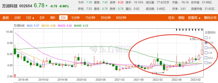 以万润科技目前的业绩来看,很难吸引资本的更多关注。2022年Q3营收仅为22.61亿元,同比下滑达30.32%,净亏损8439万元,同比下滑高达194.09%。2021年总营收44.11亿元,同比微增6.04%,净亏损3.530亿元,同比增长405.21%。这样的业绩其实几乎没法看,但就这样的情况下,万润科技的股价却直线上升,由2022年4月底的2.74元一路飙升至2023年4月底的8.56元,一年内股价提升了212.4%。