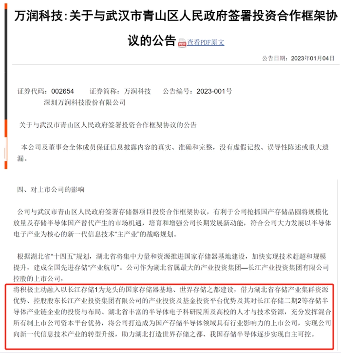 万润科技创始人李志江,1996年湖北政界下海去深圳,2002年创办的万润科技,2012年万润上市。而后来把控股权交给湖北国资委控股的宏泰集团,一个属于金融行业,一个属于工业制造,二者本明显交集,但万润科技的另一大股东是长江产业投资集团,这就和长江存储扯上了点关系。2023年1月4日,万润科技发布一则和武汉青山区签订做存储器协议的公告,公告中提及长江存储。这更给行业留下足够的遐想。