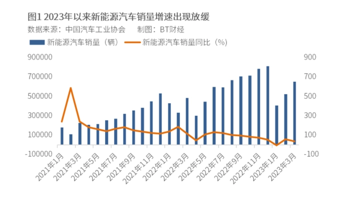 随着2022年底电动车的需求在补贴退坡前集中释放,2023年的头几个月里,电车销量势头明显放缓。中汽协的数据显示,1月新能源汽车销量同比下滑6.3%,虽然在2月和3月这个指标迅速转正、回升到+55.9%和+34.8%,但和之前的增速相比,也仍是放缓了不少。