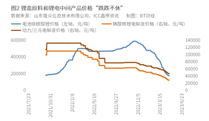 以行业上游的电池级碳酸锂为例,据BT财经统计,在2022年11月它的价格来到每吨59万元的高点后,用了46天跌穿50万元关口、50天跌破40万元关口、22天跌破30万元关口、19天跌破20万元关口……从曲线上来看,更是肉眼可见地加速俯冲,从“腰斩”跌倒“脚踝斩”。