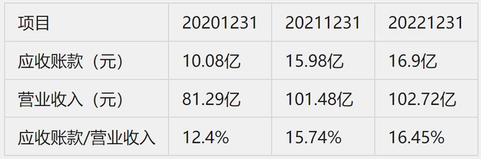 与此同时,老板电器的应收账款也在不断走高。2022年上半年,老板电器的应收账款为16.40亿元,同比上涨66.02%,而到了第三季度末,该数字已经环比增加14.39%至18.76亿元,整体情况不容乐观。2022年年底,老板电器应收账款为16.9亿元,同比2021年的15.98亿元再度上涨6%。应收账款/营业收入比值持续增长,近三期年报,应收账款/营业收入比值分别为12.4%、15.74%、16.45%,持续增长。