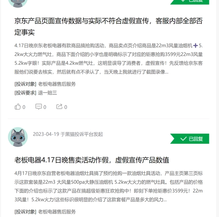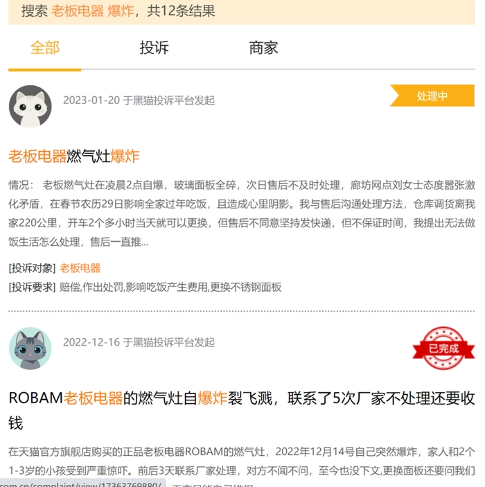 因为在“爆炸门”后关于老板电器产品爆炸的投诉屡见不鲜,仅在黑猫投诉上就有12起。最新两起则是2023年1月和2022年12月。