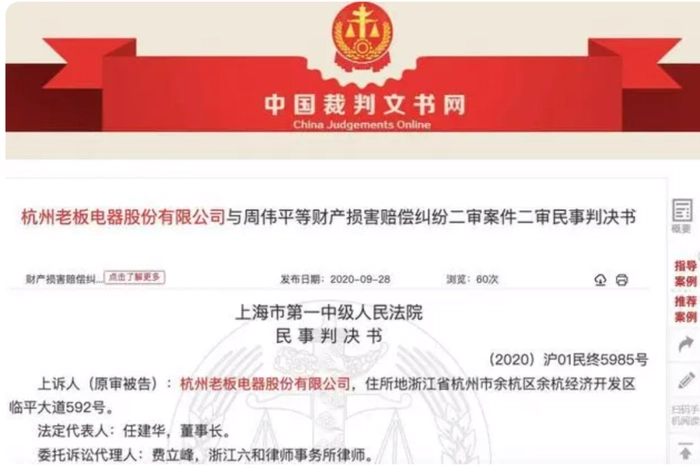 带给老板电器影响最大的就是上文提到的“爆炸门”,根据中国裁判文书网在2020年9月发布的民事判决书,消费者周某在购买老板燃气灶后出现故障,造成周某受伤以及涉案房屋内的家具、装潢等多处财物受损。最终法院判决老板电器赔偿用户财产损失共计29.08万元。