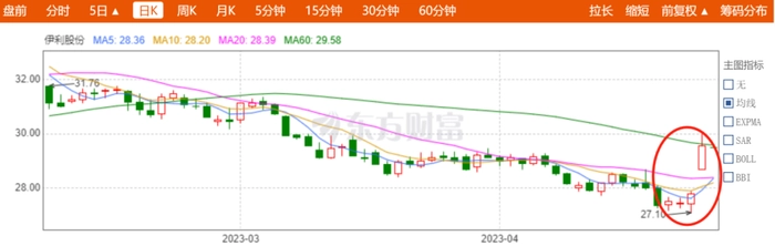 截至4月28日收盘,伊利股价暴涨6.33%,收于29.56元/股,总市值1891亿元。自4月24日以来已经录得四连涨。