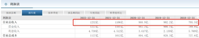 受新冠疫情的影响,近三年业绩表现已经成为衡量一个企业是否稳健的重要标准。2020年至2022年,伊利总营收分别为968.9亿元、1106亿元和1232亿元。同比增幅分别为7.38%、14.15%和11.37%。2020年因新冠疫情的突然爆发,伊利营收由2019年的13.41%的增速有所下滑,但近两年再度突破10%以上。