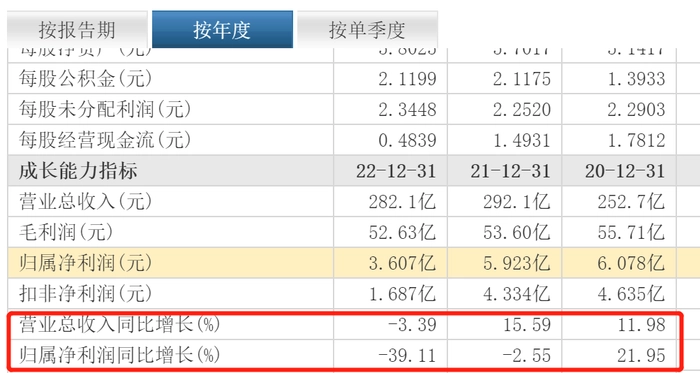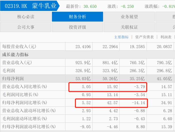 在对比另外一家知名乳业光明乳业的同期财务数据,光明乳业2020年至2022年总营收分别为252.7亿元、292.1亿元和282.1亿元。同比增幅分别为11.98%、15.59%和-3.39%。其中2022年营收出现负增长。近三年归母净利润分别为4.635亿元、4.334亿元和1.687亿元。呈逐年下降趋势。同比增幅分别为21.95%、-2.55%以及-39.11%,尤其2022年归母净利润暴跌近四成。股价同样在4月19日至4月25日录得“五连跌”。