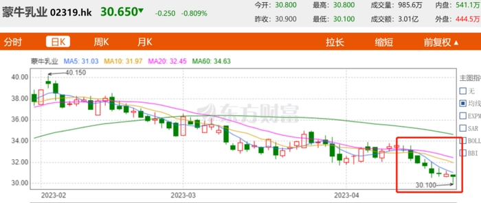 和蒙牛发布财报前后几日股价的连续下跌不同,伊利的业绩表现让投资者更为放心。对比蒙牛股价在4月18日至4月27日已经“八连跌”,在“八连跌”期间,蒙牛股价整体下跌超过10%。