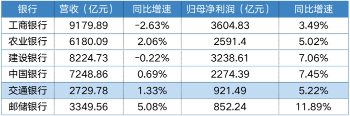 不过,从增速上来看,交通银行保持了中等水平。工商银行和建设银行在2022年的营收增速为负,交通银行则实现了微小增长。