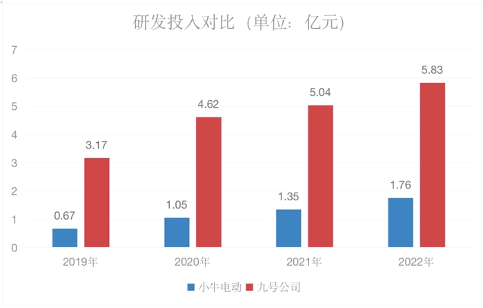 横向对比,与小牛电动直接对标的九号公司同样拥有强烈的智能标签,与其研发投入一直远高于小牛电动。2022年,九号电动的研发投入为5.83亿元,小牛电动仅为1.76亿元,仅为对方的三分之一。