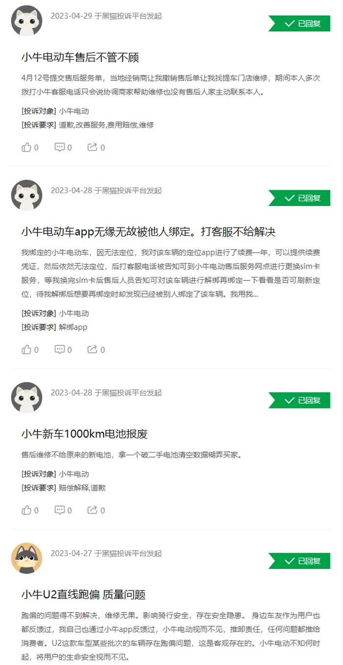 在黑猫投诉上,小牛电动的投诉量高达2000条以上,主要集中为电池质量/续航问题、售后问题等。高价却不高质,引发了众多消费者的不满,小牛电动的品牌形象也大受影响。