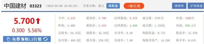 在年报的发布后第一个交易日(3月24日),中国建材的股价大跳水,收盘价为5.91港元/股,暴跌9.08%。而这种跌跌不休还在持续,截至5月8日收盘,中国建材股价为5.700港元/股,涨幅为5.56%。但距离2021年9月12.336港元的股价高点还是下跌54%,市值蒸发560亿港元,目前总市值480.8亿港元左右。