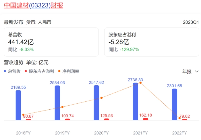 五一前最后一个工作日,中国建材发布2023年一季报。财报显示,2023年前三月,中国建材总营收441.42亿元,同比下滑8.33%;归母净利润-5.28亿元,同比-129.97%。