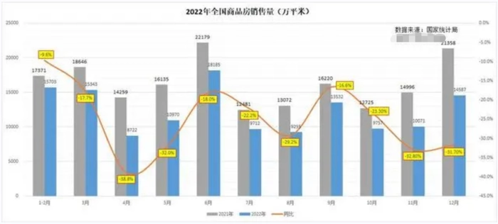 全面萎缩的根本原因在于房地产市场销量的巨大波动,自2021年下半年房地产行业进入下行周期后就一发而不可收,截至2022年12月一直在延续。尽管期间各地政府均出台刺激房地产的相关政策,但效果并不明显,仅在9月份商品房销售量出现短暂收窄,到12月份商品房销售量下降到14587万平米,同比下跌31.7%。