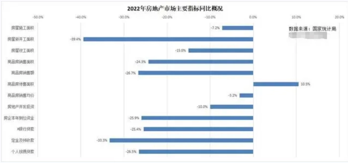 这从国家统计局公布的2022年房地产统计数据可以得到印证,全年房地产市场主要统计指标中,仅有待售商品房面积同比增长10.5%,待售面积达5.64亿平米,而其他房地产统计指标皆明显下跌。其中房屋施工面积同比下跌7.2%,房屋新开工面积12.06亿平方米,则暴跌39.4%。