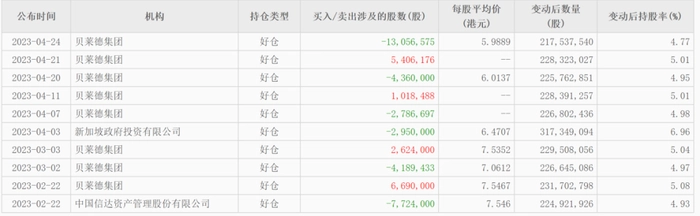 本次减持后,贝莱德集团的最新持股为2.18亿股,持股比例由5.01%下降至4.77%。自今年2月以来贝莱德集团频繁增持和减持,但总体上看,减持数量大于增持。而在今年2月22日中国信达资产管理有限公司就以7.546港元/股的价格减持了772.4万股,持股比例降为4.93%。4月3日,新加坡政府投资有限公司也以6.47港元的股价减持了295万股。