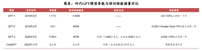 这是中信证券做的一个统计表,现在看ChatGPT3.5每次训练成本就超过1,200万美元,更别提比他更高级的ChatGPT4。有专家预计ChatGPT4的训练一次会超过5,000万美元。