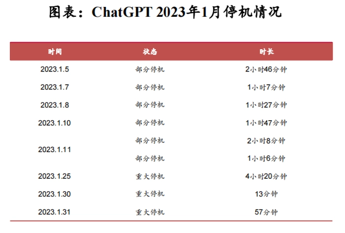 2023年1月ChatGPT访问量环比增长119.4%,用户访问量的激增导致ChatGPT发生了因云算力不足而宕机的情况。据OpenAI数据,1月ChatGPT重大停机(Major outage)时长为5小时30分钟,部分停机(Partial outage)16小时21分钟,运营算力不足已经开始影响ChatGPT的稳定性和响应速度。