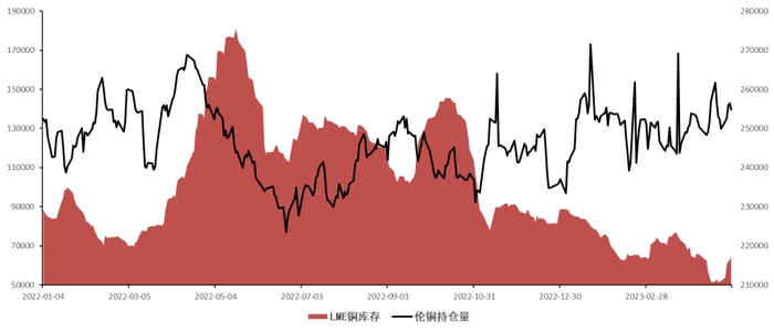 伦铜库存和盘面持仓量 |