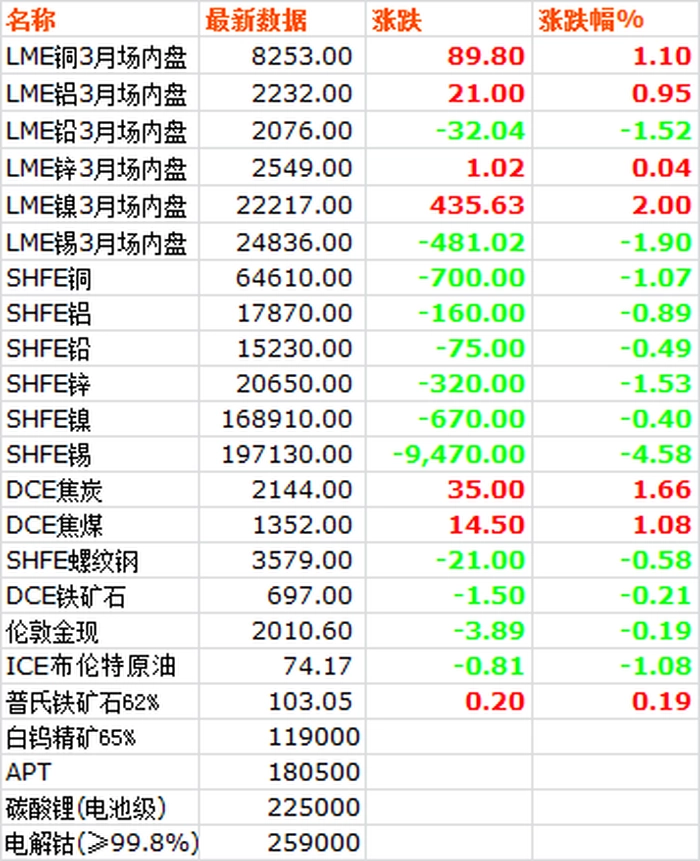 5月12日,LME六种基本金属价格涨多跌少,锡铅下跌,其它金属反弹上扬,镍铜涨幅居前。三月期锡价领跌,收于24836,下跌1.9%。三月期铅价收于2076,下跌1.52%。三月期镍价大幅反弹上扬,收于22217,上涨2%。三月期铜价收于8253,上涨1.1%。三月期铝价收于2232,上涨0.95%。三月期锌价收于2549,上涨0.04%。