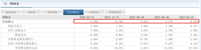 同期12家股份制银行中,除去广发银行和恒丰银行未上市之外,大部分银行在2023年一季度营收都是负增长,已经“爆雷”的渤海银行并未披露单季报,而在中报和年报中,渤海银行已经连续4个报告期负增长。