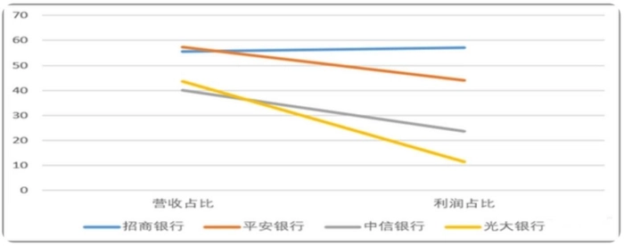 再看2022年招商银行、平安银行以及中信银行3家股份制银行的零售业务营收占比,招商银行零售业务占总营收比例是55.52%,平安银行的零售业务占比为55.9%,中信银行的零售业务占比为40.1%。光大银行的零售业务占比有一定提升,和招商银行以及平安银行的营收占比相比还有不小差距,即便营收占比上超过中信银行,但利润占比却低于中信银行不少。