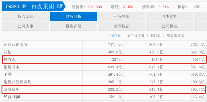 2023年一季度,百度的研发费用为54.23亿元,占总营收311.44亿元的17.4%。以完整财年来看,2022年百度研发费用为233.2亿元,研发占比为19%;2021年研发费用为249.4亿元,研发占比为20%;2020年研发费用为195.1亿元,研发占比为18.2%。近三年整体研发占比均高于18%。而互联网行业研发占比的平均值为3%-6%之间,比如小米的研发占比4%左右,联想研发占比2.5%,京东研发占比为1.6%,国内互联网企业研发占比超过10%的只有2家,一家是百度,另一家则是华为。